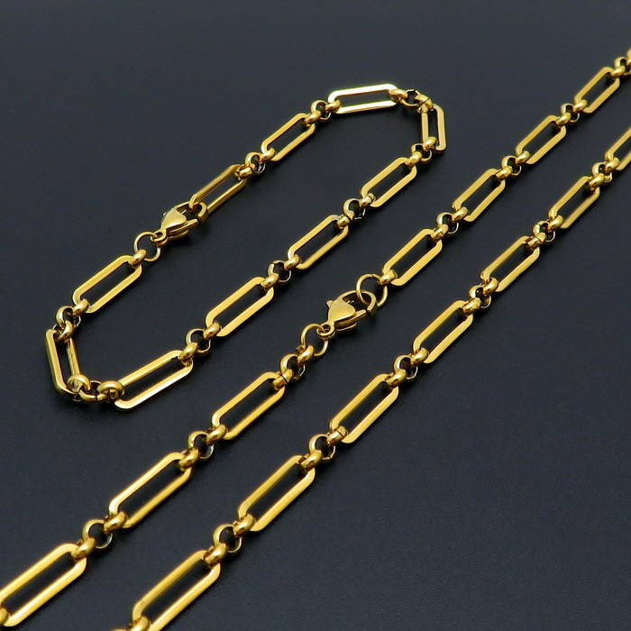 Obľúbený zlatý set retiazky a náramku s veľkými oválnymi očkami z chirurgickej ocele, ktorý pre svoju univerzálnosť je dokonalým doplnkom, lebo s ním skutočne nič nepokazíte iba získate!