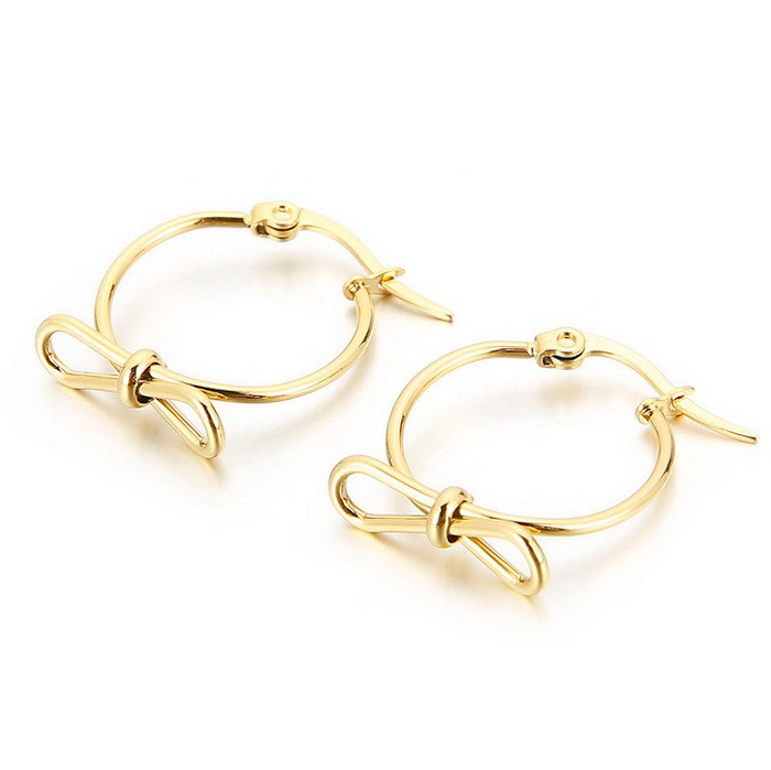 Exkluzívne kruhové náušnice v zlatom prevedení s dizajnom mašličiek, vhodné ako darček, ktorý zaručene poteší každú ženu, ktorá má rada netradičné kombinácie.